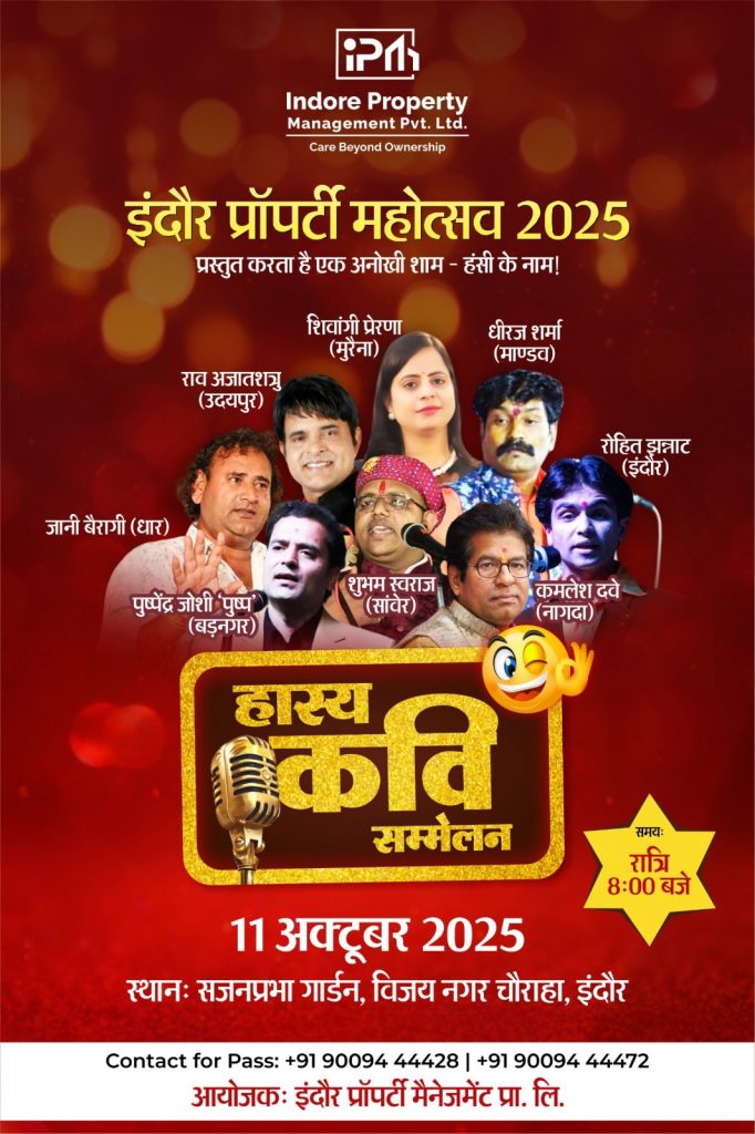 इंदौर। शहर में 11 और 12 अक्टूबर को दो दिवसीय “इंदौर प्रॉपर्टी महोत्सव” 2025 चल रहा है, इस दौरान शनिवार को रात्रि 8 बजे से सजन प्रभा गार्डन, विजय नगर में हास्य कवि सम्मेलन का आयोजन किया गया है।इन्दौर प्रॉपर्टी मैनेजमेंट के निदेशक संतोष प्रसाद पाल ने बताया कि ‘अखिल भारतीय हास्य कवि सम्मेलन’ में जानी बैरागी, राव अजातशत्रु, पुष्पेंद्र जोशी ‘पुष्प’, शिवांगी प्रेरणा, धीरज शर्मा, रोहित झन्नाट, कमलेश दवे काव्य पाठ करेंगे। कवि शुभम स्वराज कवि सम्मेलन के संयोजक रहेंगे। आयोजन के निःशुल्क पास कार्यालय पर उपलब्ध है।’
