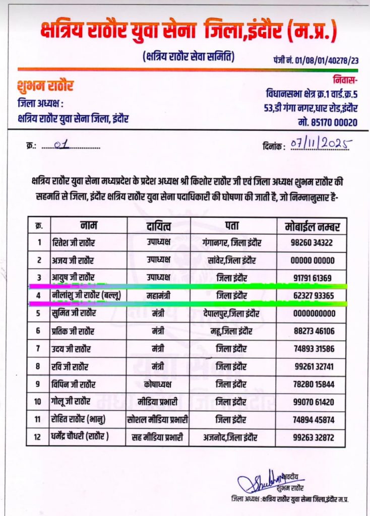 इंदौर। क्षत्रिय राठौर युवा सैना इंदौर जिला अध्यक्ष शुभम राठौर ने सामाजिक कार्यकर्ता गोविंद राठौर की अनुशंसा पर युवा समाजसेवी निलांशु राठौर को क्षत्रिय राठौर युवा सेना इंदौर जिला का महामंत्री नियुक्त किया। निलांशु राठौर बल्लू ने बहुत ही कम समय में समाजसेवा के कार्यों में महती भूमिका निभाकर अपनी पहचान बनाई है। निलांशु राठौर को महामंत्री बनने समाजबंधुओ इष्ट मित्रों ने बधाई दी। उक्त जानकारी क्षत्रिय राठौर युवा सेना जिला इंदौर मिडिया प्रभारी गोलू राठौर ने दी ।