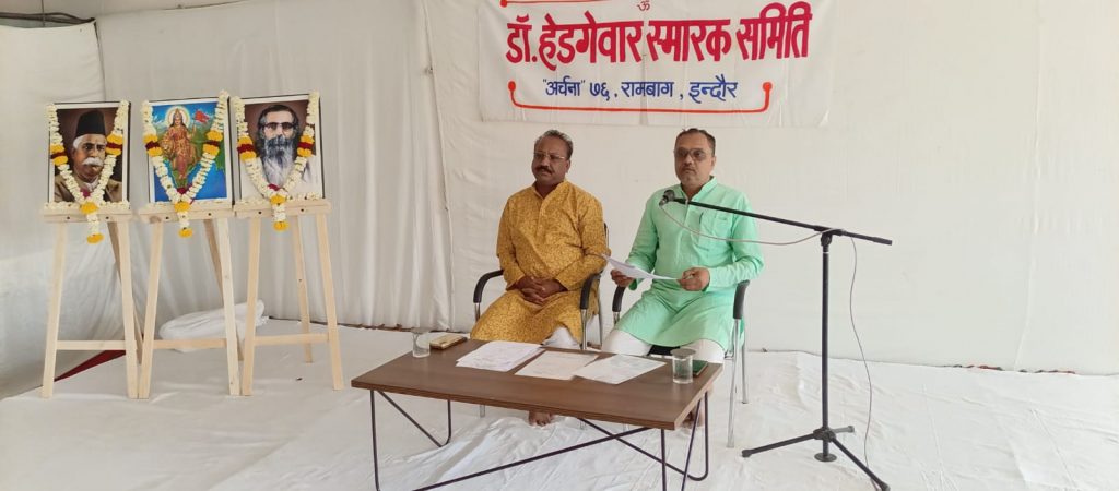 इंदौर। डॉ. हेडगेवार स्मारक समिति के स्थापना दिवस एवं नववर्ष के उपलक्ष्य में मंगलवार को वरिष्ठ स्वयंसेवकों का एकत्रीकरण और कार्यकर्ताओं का शताब्दी वर्ष के निमित्त समय समर्पण भाव जागरण कार्यक्रम सुदर्शन भवन, पंत वैद्य कालोनी पर रखा। समिति के सेवा प्रकल्पों की प्रदर्शनी भी लगाई गई।कार्यक्रम के मुख्य वक्ता मालवा प्रांत के बौद्धिक प्रमुख सुनील बागुल ने स्वयंसेवकों को संबोधित करते हुए कहा कि समाज जो देखता है उसी का अनुसरण करता है। स्वयंसेवक के व्यवहार से समाज को सीख मिलती है। संघ की सेवा गतिविधियां समाज में पैठ बनाने का सशक्त माध्यम है। शताब्दी वर्ष निमित्त पथ संचलन एवं हिंदू सम्मेलन में समाज की भूमिका इसका अनुपम उदाहरण है।